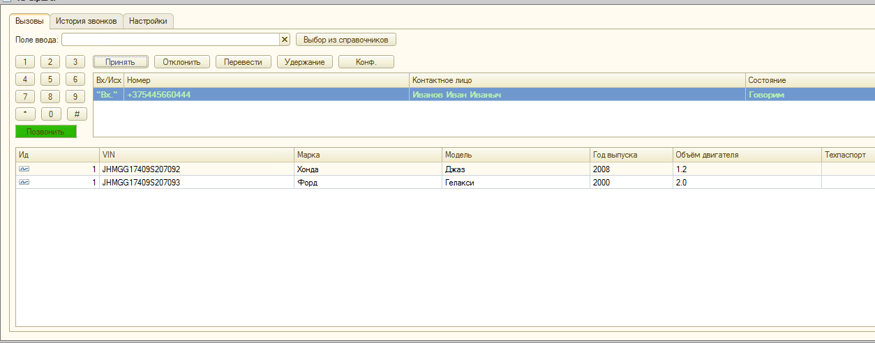 При подключении к базе 1С автозапчастей встроенной телефонии, все звонки будут обрабатываться на платформе 1С Предприятие 8. При появлении входящего звонка от существующего клиента, данные о его автомобиле и некоторые личные данные будут доступны в удобной панели в 1С!